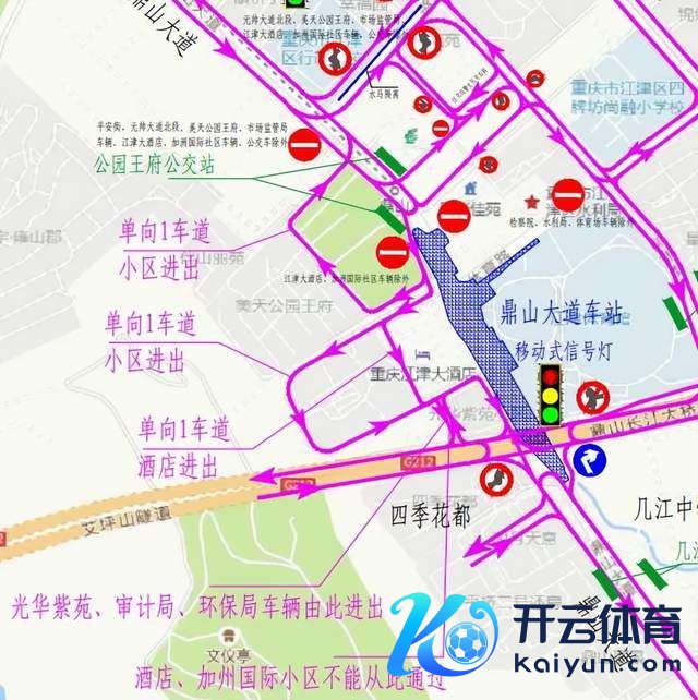 3、江津大酒店、龙煌加洲国外车辆由北向南经鼎山大路西侧辅谈、小区里面谈路、酒店里面谈路、鼎山大路西侧既有非纯真车谈单向通行,在鼎山转盘处进行交通通行调遣。